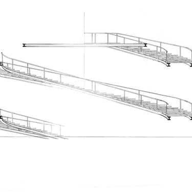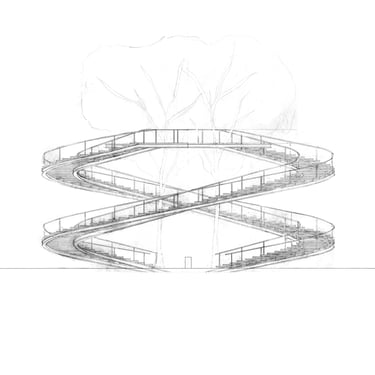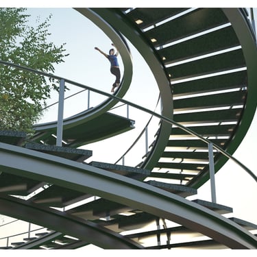 Two stairs spiral around two existing trees, choreographing an ascent that is also a confrontation.
