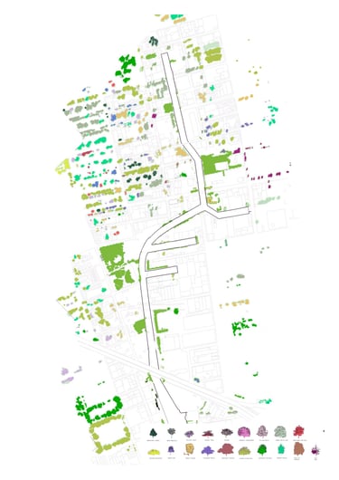 Planted trees comprise most of the neighborhood vegetation, but the area directly surrounding the canal is dominated by spontaneous sumac and pioneer shrubs