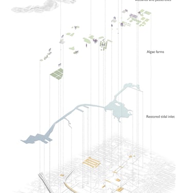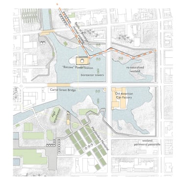 The Gowanus Algae Park proposes to redevelop the floodplain around the Gowanus Canal with a variety of algae farms, wetlands, and parks to mitigate the effects of flooding, purify the water, and reinvent the industrial character of the area.